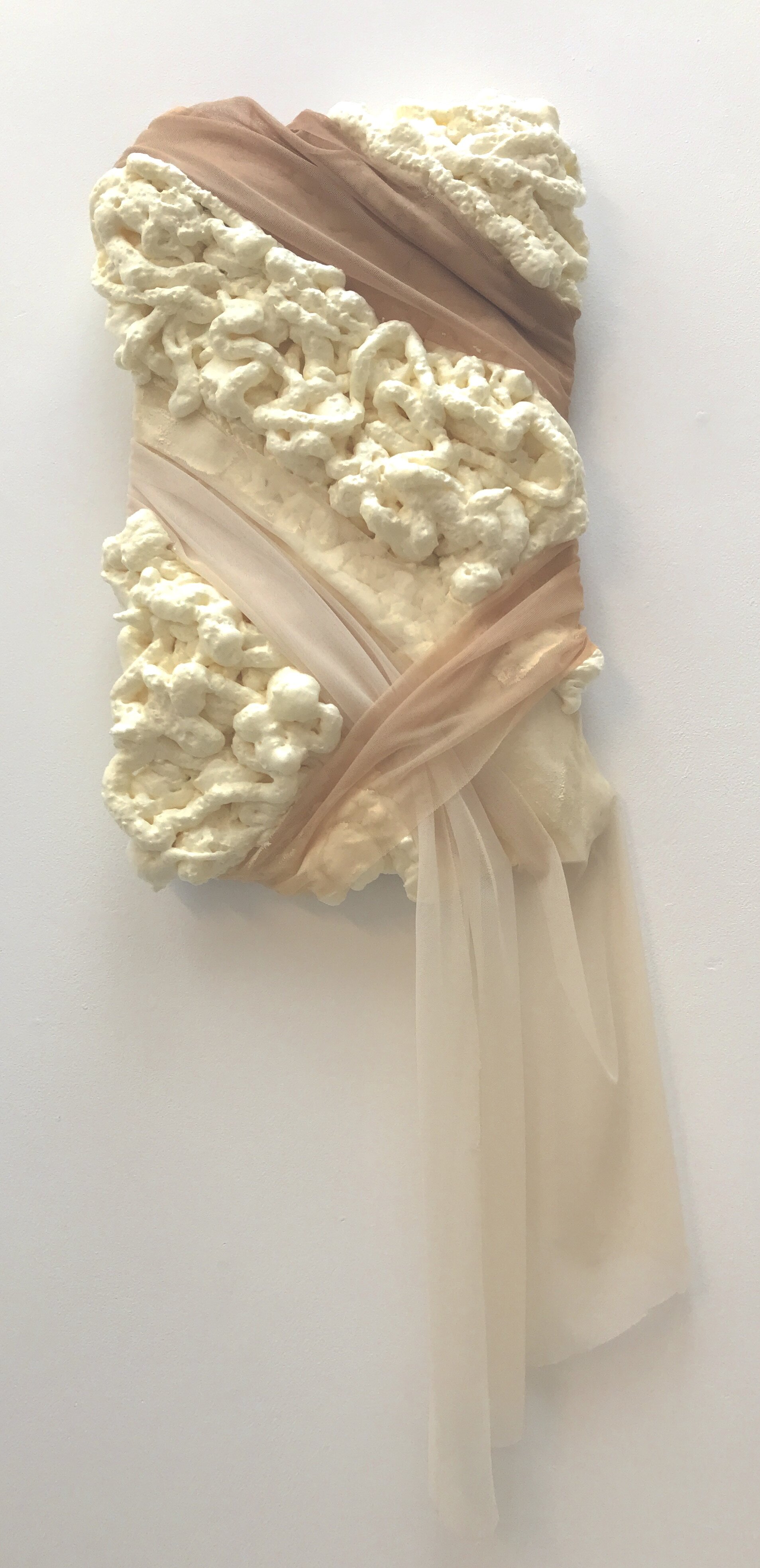 In October 2020, out of a growing need to personally synthesize my long series of previous engagements with themes of feminism, the body, and cultural/racial identity, I looked inward to create Under Wraps. Using spandex mesh that commercially is used in women’s compression undergarments, I created a series of work that explores the tension of my biracial experience as it relates to the female body. On my Japanese side, it feels preferred to keep things under wraps and not draw attention to oneself. In contrast, I feel that individualism and extroversion are celebrated in the U.S. With pieces of organically shaped fabric, fragmented lucite pieces, and voluptuous insulation foam spilling out from behind the taught spandex mesh, I explore how these conflicting messages coexist. The work also ties into themes of body shame, constructed femininity, and a subversion of the ethos to control women’s bodies.